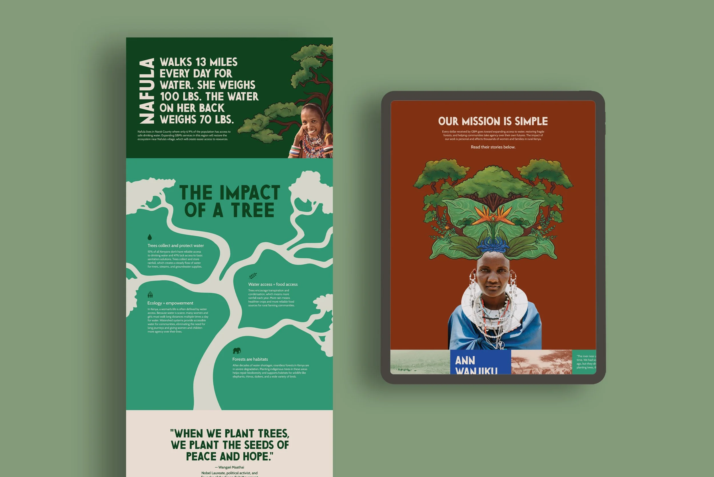 Since GBM’s charismatic founder, Wangari Maathai, passed away in 2011, it has been hard for the organization to build momentum on a global level. With their “It Takes a Village” campaign, GBM wanted large eye-catching graphics that would stand out and strengthen both brand awareness and donations with a younger audience